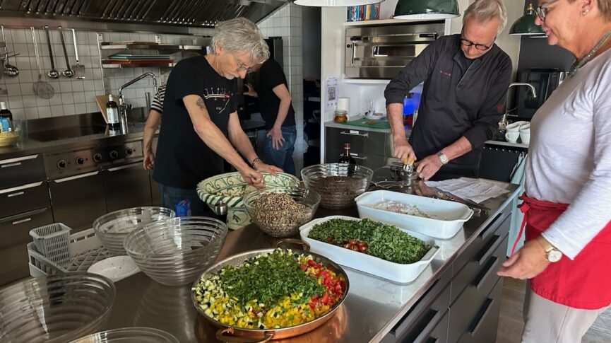 Wer so chrampft, hat auch Hunger. Darauf war das Kochteam vorbereitet. Aus 1 kg Kichererbsen, 1 kg Linsen, ½ kg Quinoa, 1 kg Couscous, 3 Granatäpfeln, 2 kg Tomaten, Zwiebeln, Rucola, Frühlingzwiebeln, Feta und so weiter hatte das Team um Hansruedi mit viel Rüstarbeit, Knowhow und Liebe vier wunderbare Salate komponiert. Dazu eine mega Käseplatte von Ingrid nebenan, und fertig war der Fitnessteller für die hungrigen Arbeiter*innen.
