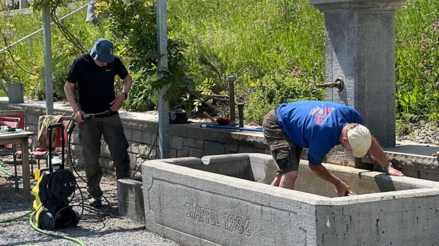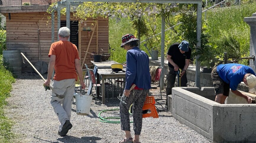 Tageschef Bruno und sein Team hatten alles minutiös vorbereitet, und so herrschte bereits kurz nach 9 ein emsiges Treiben in der Siedlung. Da wurde gekärchert, was das Zeug hält; Scheiben geputzt, «schöner nützti nüt»; im Beerenhain, auf dem Platz und auf den Kieswegen gejätet, der Rücken lässt grüssen; ja selbst der Brunnen ist nun «putzt und gstrählt».