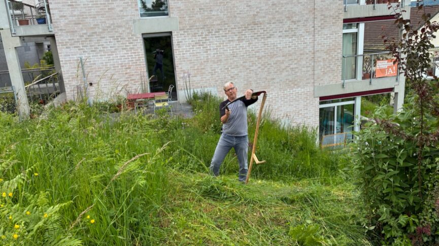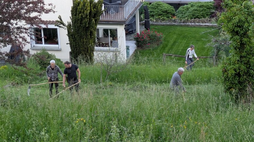 Scharf wie eine Rasierklinge war das Sensenblatt dann nach dem Dengeln. Und die Wildheuer bereit für den Ernstfall in einem grossen Nachbargrundstück, das es zu mähen galt. Und, siehe da, das Mähen ging deutlich leichter von der Hand als zuvor.