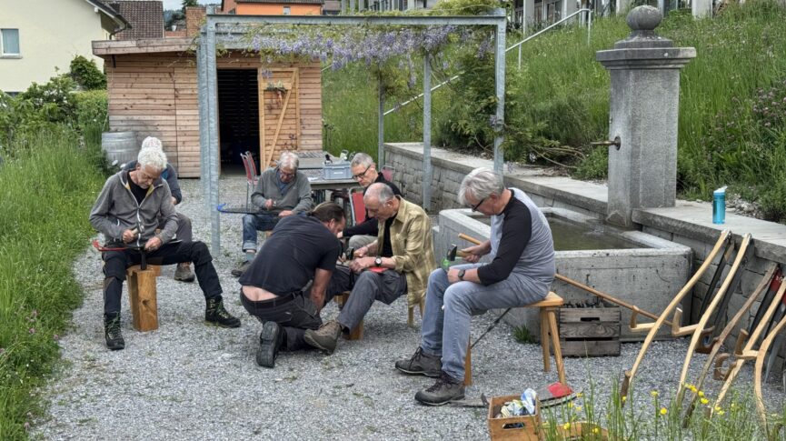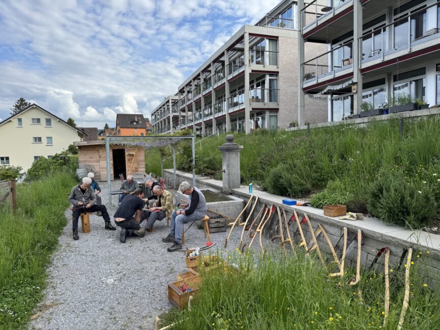 Unsere Wildheuer nahmen die Herausforderung an und liessen sich kürzlich vom Fachmann Remo Stauber, gelernter Schmied von Beruf, in die Kunst des Dengelns einführen. Tok, tok, tok, hallte es in unregelmässigem Rhythmus eine gute Stunde von der Gartenseite der Siedlung her. Die Wildheuer selbst hatten nichts von diesem Klangspektakel; um ihre Ohren zu schonen, arbeiteten sie mit Ohrenstöpseln.