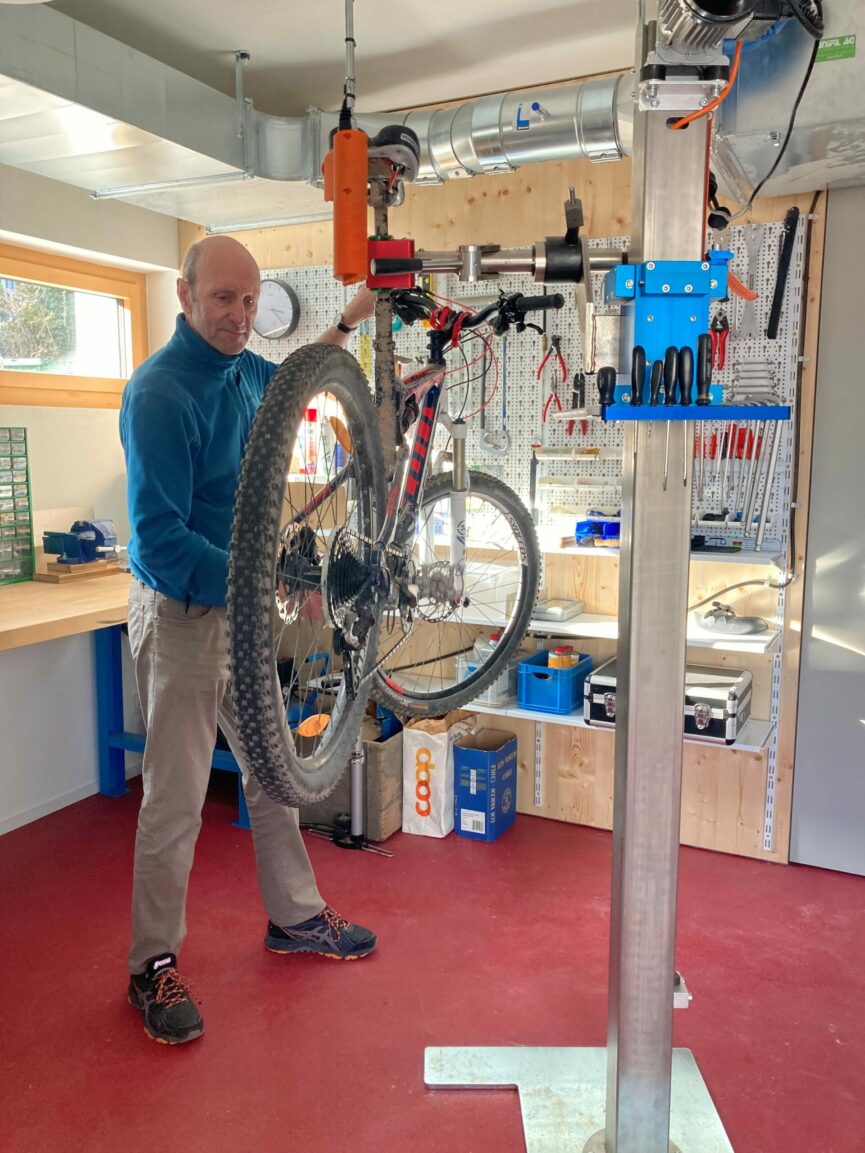 Ausgerüstet mit einem professionellen Velolift, einer Werkbank und Werkzeugen für allgemeine Bastelarbeiten bietet sich die Velo- und Bastelwerkstatt für alle Velo-Fans und Hobbybastler:innen an.
